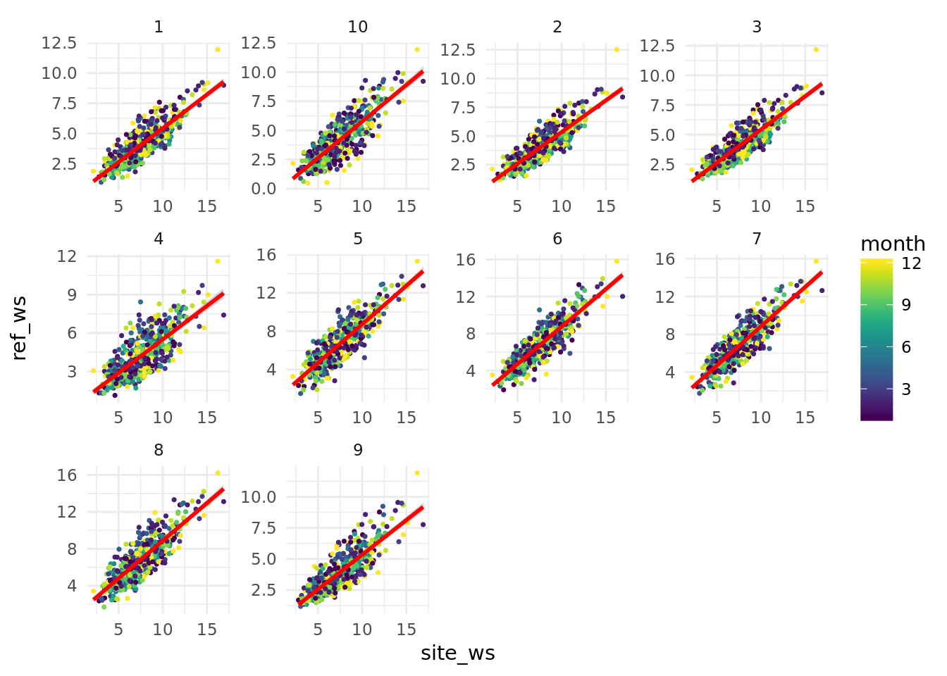 Now we can cycle through our reference stations to get the correlation results while leaving out Referene Stations 9 and 10 because of the suspected inconsistency discussed above. Here is an example of a daily correlation binned by month between our site and Reference Station 1